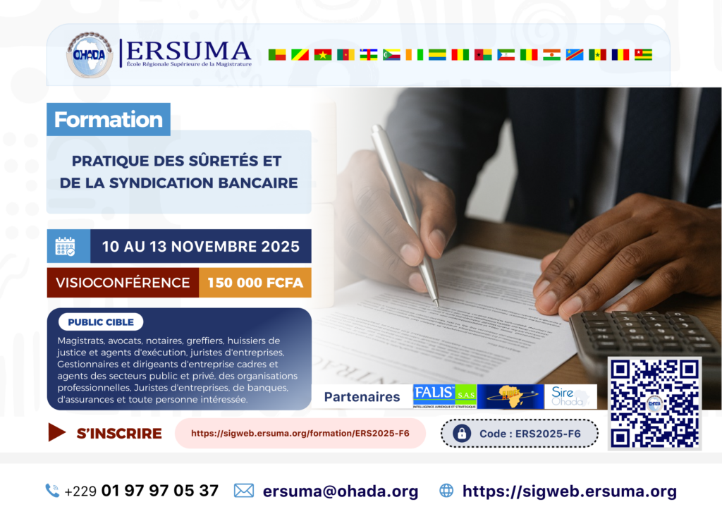 The Regional Advanced School of Magistracy (ERSUMA) of the Organisation for the Harmonisation of Business Law in Africa (OHADA), in partnership with the Firm SIRE OHADA and the African Association of Banks and Financial Instutions’ Legal Experts (AJBEF), is organising an online training session from 10 to 13 November 2025 on the theme: “Practice of Security Interests and Syndicated Lending”.
