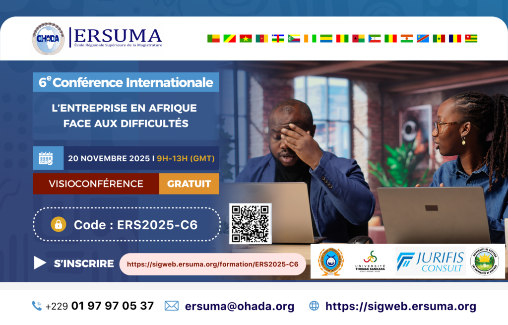 The Regional Advanced School of Magistracy (ERSUMA) of the Organisation for the Harmonisation of Business Law in Africa (OHADA), in partnership with the University of Dschang, the Thomas SANKARA University, the University of Bertoua and Jurifis Consult Firm, is organising its 6th international conference by videoconference (Zoom) on Thursday 20 November 2025 on the theme “AFRICAN ENTERPRISES IN THE FACE OF CHALLENGES”.