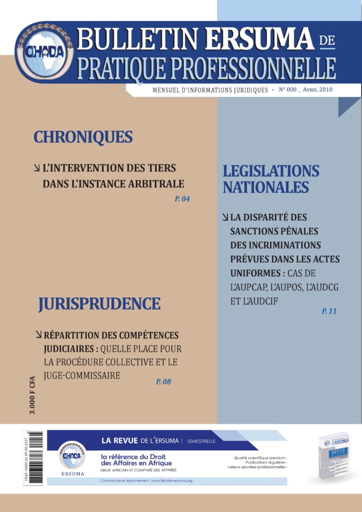 L’ERSUMA vous annonce la parution du huitième numéro de son mensuel dénommé Bulletin ERSUMA de Pratique Professionnelle (BEPP). Ce périodique vous informe sur l’actualité du droit des affaires, qu’il s’agisse du Droit OHADA, du Droit national des Etats Parties, des autres Droits communautaires africains et du Droit comparé.