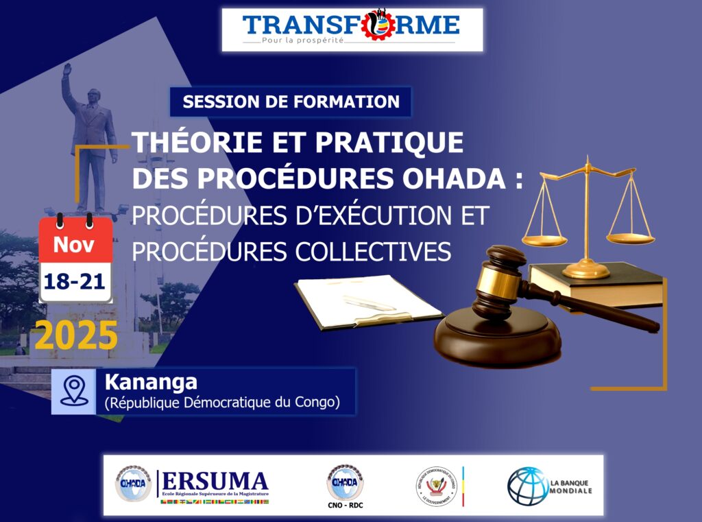 A Escola Regional Superior da Magistratura (ERSUMA) da Organização para a Harmonização do Direito dos Negócios em África (OHADA), em parceria com a Comissão Nacional da OHADA (CNO) da República Democrática do Congo (RDC) e com o apoio técnico e financeiro do Banco Mundial através da Unidade de Coordenação do Projeto TRANSFORME (UCP), organiza de 18 à 21 de Novembro de 2025 em Kananga e depois de 25 à 28 de Novembro de 2025 em Mbuji-Mayi duas sessões de formação sob o tema: “Teoria e prática dos Processos OHADA: processos de execução e processos coletivos”.